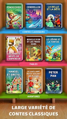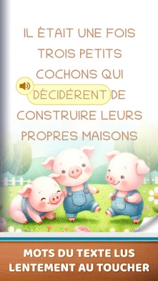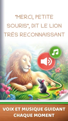 Plongez dans des univers riches, où chaque illustration, unique à sa page, donne vie aux récits et enrichit la compréhension. L'ambiance sonore n'est pas en reste : une musique de fond adaptative tisse une atmosphère immersive qui évolue avec le déroulement de l'histoire, captivant l'attention. Pour les lecteurs en herbe, Contes Courts propose une lecture à voix haute d'une clarté remarquable, permettant de suivre les mots simultanément. Et pour affiner la prononciation, une simple touche sur un mot active sa prononciation ralentie, décomposant chaque son pour une assimilation parfaite.