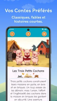 Plongez dans un univers enchanté avec notre application de contes pour enfants. Elle éveille l'imagination, offre des histoires magiques et éducatives, et invite à l'apprentissage en s'amusant. Une expérience captivante et sûre pour les jeunes esprits curieux.