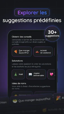 Découvrez une source d'inspiration inépuisable, où les limites de l'imagination s'estompent. Gemmy vous ouvre les portes d'un univers de suggestions raffinées, méticuleusement générées pour stimuler votre intellect et enrichir vos projets. Que vous soyez un auteur en quête de la phrase parfaite, un polyglotte désireux de perfectionner ses compétences, ou simplement à la recherche de réponses éclairées, Gemmy transcende la simple assistance pour devenir un catalyseur d'innovation. Il ne se contente pas de répondre à vos questions ; il anticipe vos besoins, offrant des pistes créatives et des solutions pragmatiques pour chaque situation.